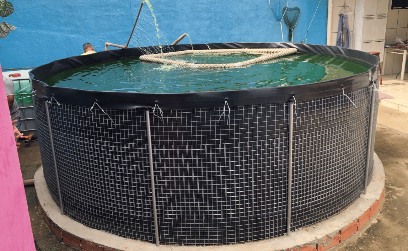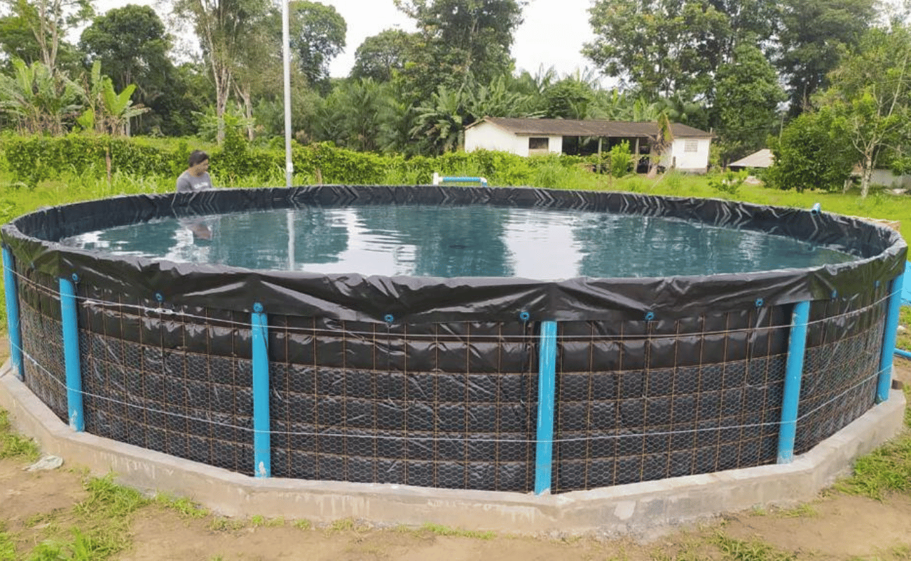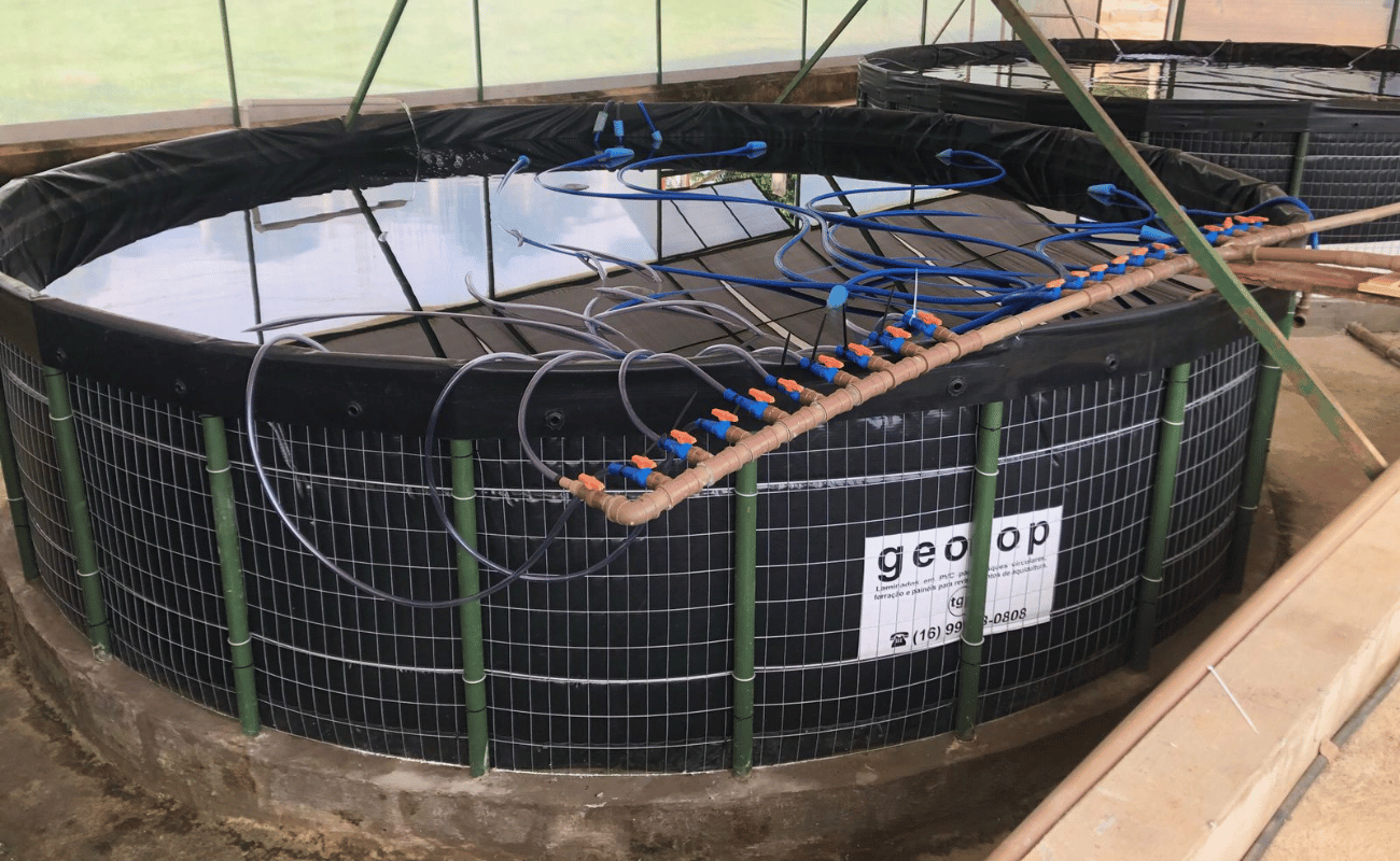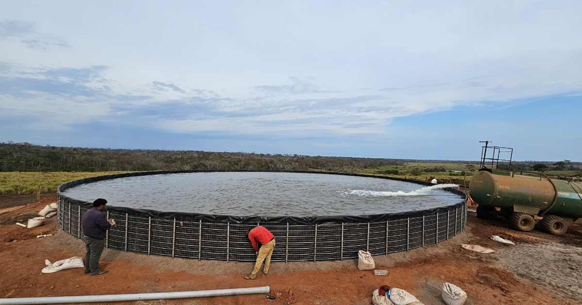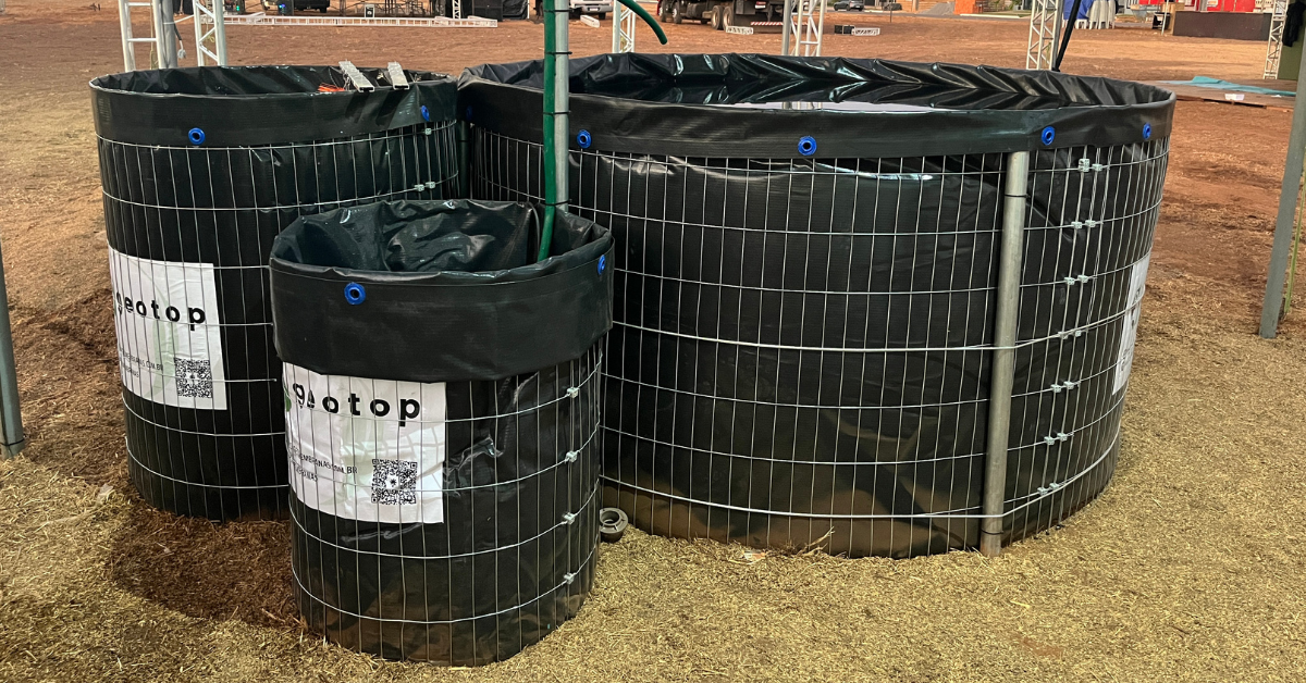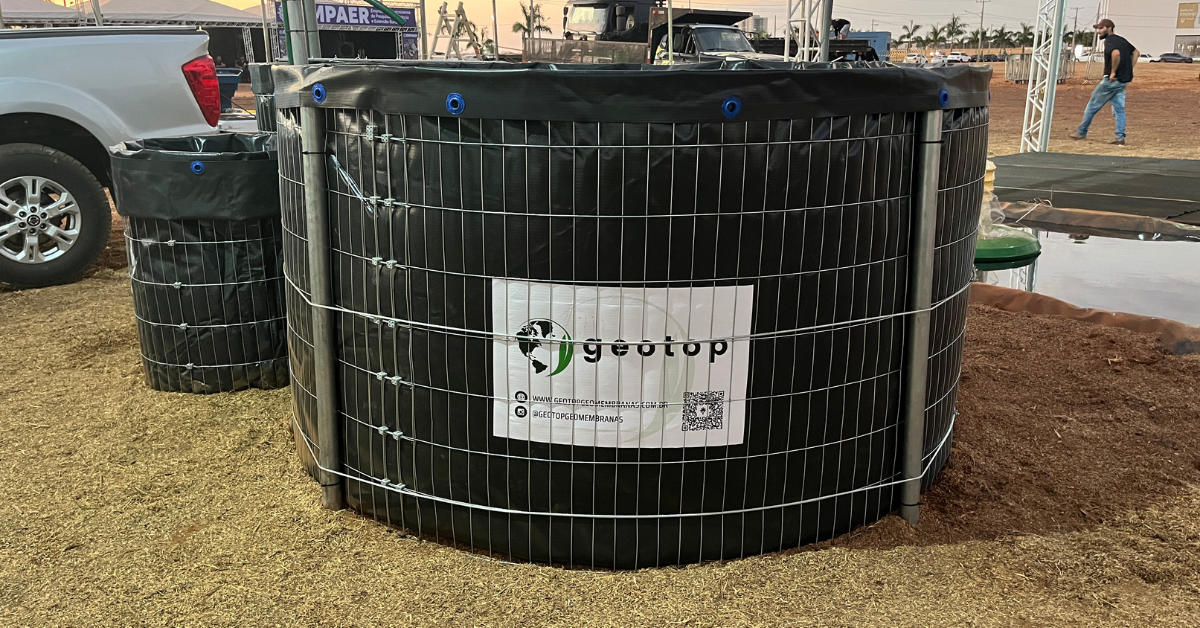 Tanques Elevados Circulares, popularmente conhecidos como “bolsões”, são confeccionados com a Geomembrana Geotech. Destaca-se por possuir a adição da trama interna entre as duas camadas de PVC proporcionando maior resistência ao material, sem perder flexibilidade e maleabilidade.