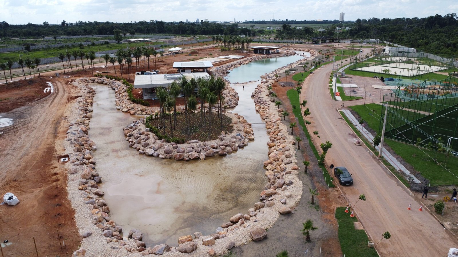 O lago ornamental compõe o conceito moderno do condomínio, agregando estética, sofisticação e valorização ao empreendimento.